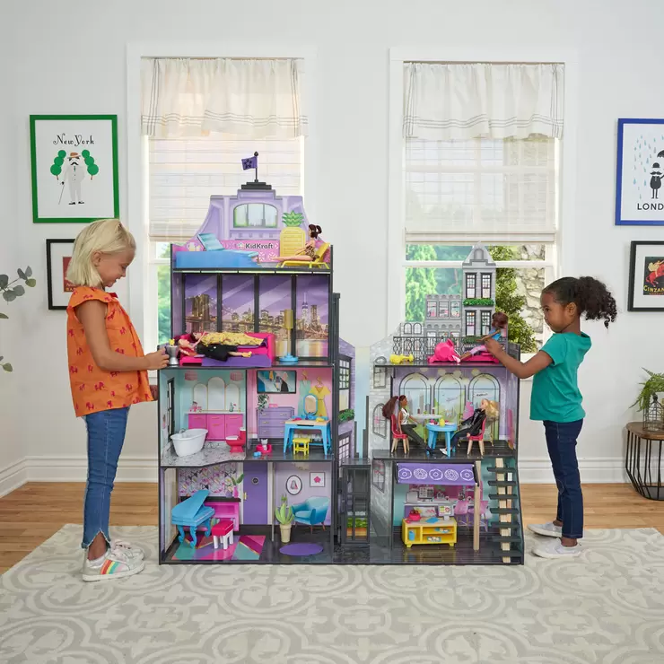 Live and play in chic city style. The almost 5 foot tall 2-in-1 Penthouse & Café Dollhouse by KidKraft boasts a modern four-story apartment and attached three-level business complex. The penthouse side includes a living area, bathroom, bedroom, and even a rooftop patio with cool infinity pool. From enjoying the grand piano that really plays music to watching the skyline change from day to night, dolls will love living in this glam setup. Walk across the way to visit or even work at a cute street-level bakery, complete with baked goods and a cash register. Up above, you can enjoy your lunch at the quaint bistro. At the top level, discover a gym with an exercise bike and dumbbell weights. A three-level elevator connects the penthouse and the business for ease of travel. With an astounding 60-piece accessory set, there’s plenty of hands-on play for all-day fun. With premium wood materials, a dollhouse by KidKraft is made to last and love.