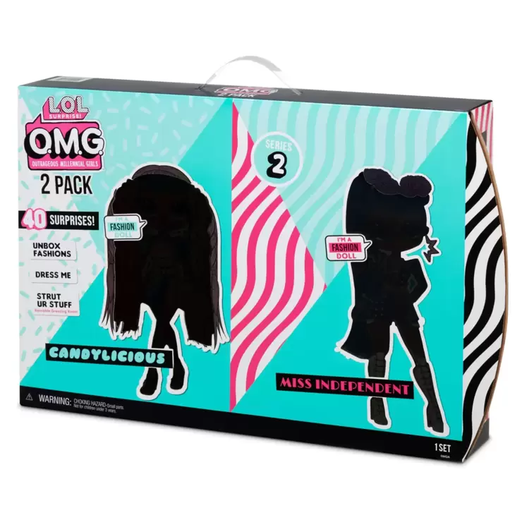 Unbox 2 L.O.L. Surprise! O.M.G. fashion dolls – Candylicious and Miss Independent – with 40 surprises. Each doll has stunning features, beautiful hair, and her own fabulous style. They're the big sisters to fan favorite L.O.L. Surprise!™ characters, Bon Bon and Independent Queen. Unbox to find two interior packages. Slide each package apart to reveal your doll's picture, bio and the first set of surprises. Her fashions are ready to be unboxed from fabulous garment bags, her shoes have their own shoebox, and her hat box holds her accessories. Keep unboxing to reveal the dressing room, where each fashion doll is hanging out, ready to get dressed in her fierce fashions. Have her strike a pose to show her off on her included doll stand.