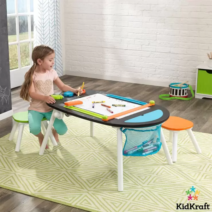 The KidKraft Deluxe Chalkboard Art Table with Stools will be the creative hub of any children's playroom. A roll of art paper mounts under the table, feeds through a slot and fastens to the table top, creating a secure work surface for your child's art creations. A trio of sealable spill-proof paint cups keep paint fresh and where it belongs! The mesh storage compartment holds supplies so little artists can keep their workspace clean as they unleash their imagination onto the art table. A chalkboard coating covers the entire tabletop for a sleek look that both children and parents love. Two bright, children size stools are also included in this set so multiple children can draw and create masterpieces together.