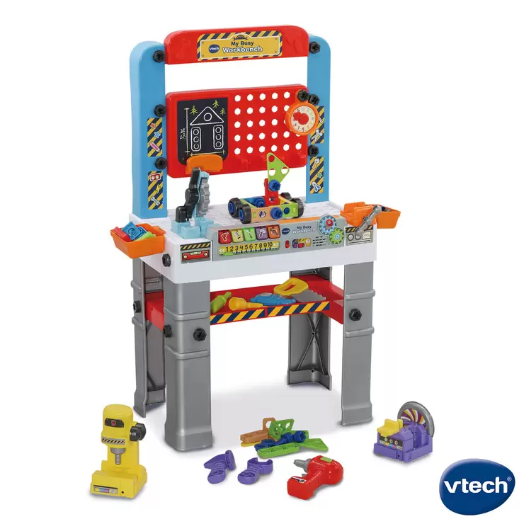 This toy workbench is sure to hit the nail on the head for your little builder! Discover 3 detachable smart tools which trigger fun responses on the workbench smart recognition point, with 119 pieces included in total. Assemble the workbench and then play and create with 61 play pieces, including screws, nails, nuts, bolts, hammer, spanner, drill, screwdriver, saw and more. A double-sided 6 page booklet features 2D and 3D build projects. Press the 5 light up buttons on the panel for more fun role-play responses. This play set includes 3 modes of play: Free play, Quiz mode and Music mode!