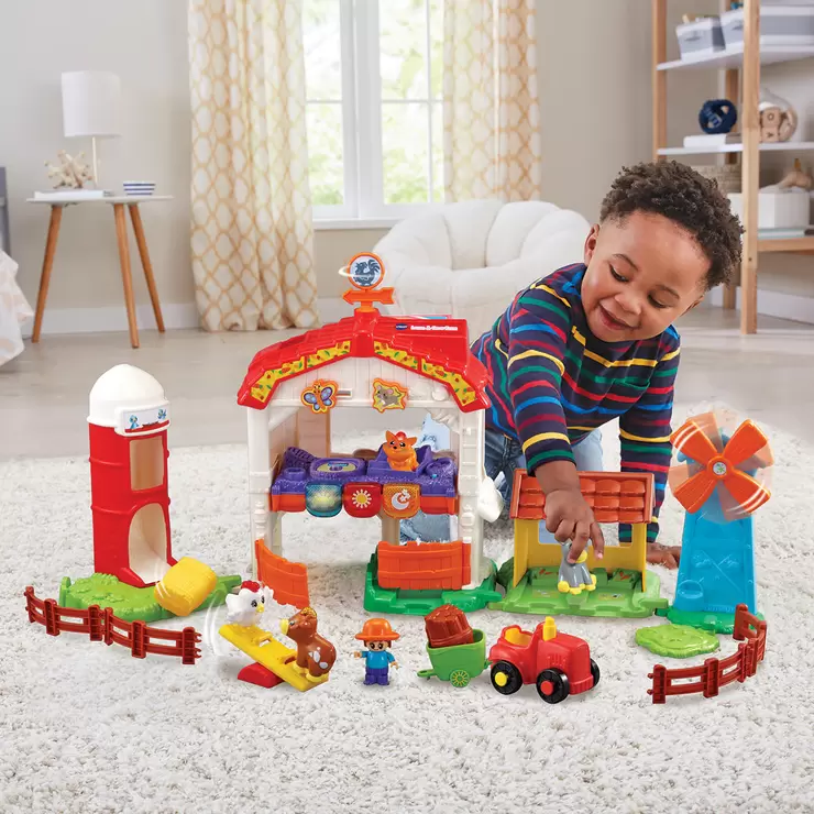 This super cute farm play set is all about discovering, playing and exploring! Featuring a moveable play panel that gives different responses depending on whether it’s in or out of the farm building! 3 chunky, light up buttons teach times of the day; morning, afternoon & evening with fun character related phrases about what the animals do around the farm at those times! Place the farmer & animals on the Talking Point to hear them introduce themselves with fun facts through the two modes of play; Playtime and Farm time. Includes 3 sing-along songs and 12 fun melodies. Encourage language development and imaginative play.
