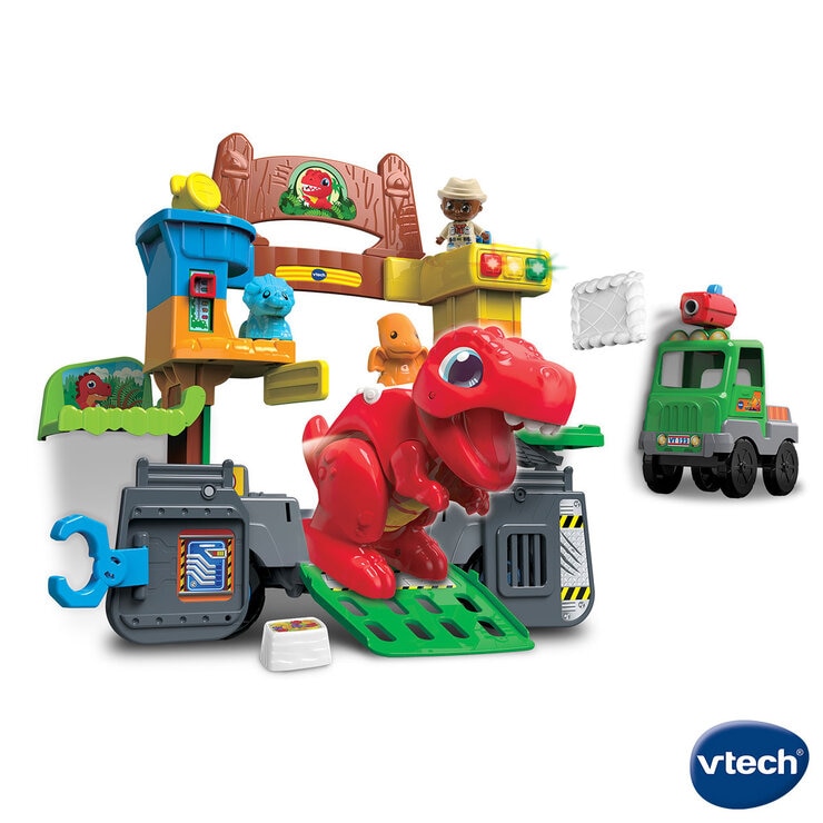 Welcome to the Toot-Toot Friends™ 2-In-1 Dinosaur Park by VTech®! Hop in and get ready for a Dinosaur adventure in this truck which opens up into an amazing Dinosaur park! Explore the park with the Park Ranger, and interact with the dinosaurs, such as the Pterosaur and the Triceratops! Place these characters onto the MagicPoint™ location to see them respond with fun phrases, sing-along songs, lively sounds and more! Featuring 3 imaginative modes of play and multiple play areas to explore and discover! Launch the net, feed the dinosaurs and push the truck and big red T-Rex along for even more role-play fun!