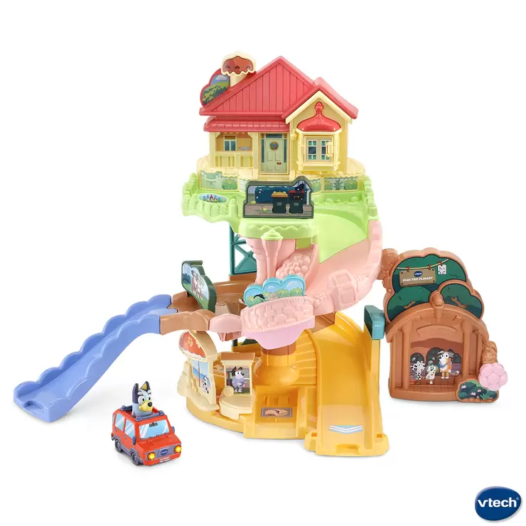 Zoom past favourite characters and moments from the show while listening to Bluey talk by pressing her head button or driving over the 4 SmartPoint™֭ locations; Play set includes Bluey's family car with light up headlights; Press Bluey to hear fun phrases in her real voice, 1 sing-along song and 6 melodies; Press the chimney to launch the car down the tracks, use the track switch to change direction, open the house window to say hello or twist the flower; Play set is compatible with other Toot-Toot Drivers® play sets (each sold separately).