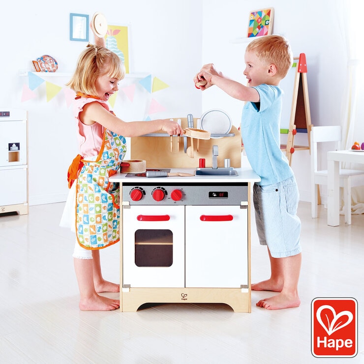 With its turnable, clicking knobs, fridge with shelf, oven with window, water tap and sink, the White Gourmet Kitchen has everything you need to prepare a delicious meal. Look through the window as you bake in the oven and store your food in the fridge. The White Gourmet Kitchen comes complete with kitchen worktop including shelf & hangers, two hobs with adjustable knobs, sink with two adjustable knobs for hot and cold water, fridge, cupboard with shelf and an oven with window and shelf. Hobs include adjustable knobs that make realistic clicking sounds when turned. The kitchen’s sink and its adjustable hot and cold taps can be removed for cleaning purposes. Oven includes a window in door for observation. Fridge and oven both include a shelf. Made using high-quality wood for a realistic, modern look that is both sturdy and highly durable.