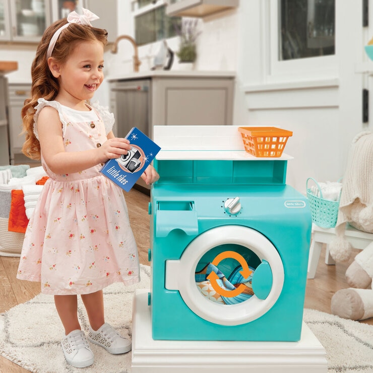Little ones can pretend to wash and dry clothes just like the grown ups with the super realistic Little Tikes® First Washer-Dryer. This sleek, modern pretend play washer-dryer is packed with interactive features: a tumbling drum, a sliding detergent drawer, a tabletop for folding clothes, and built-in slots for storage baskets. Plus, it makes realistic sounds like dials turning, spinning drum sounds, beeps, cycles changing, and more to really extend the pretend play for hours. Pretending to do laundry and other chores helps kids gain a sense of responsibility, an important part of social-emotional learning. The First Washer-Dryer is easy to set up to its full size, and fits all 11 included accessories for easy clean-up too. Encourage kids to engage in imaginative pretend play with the First Washer-Dryer by Little Tikes®!