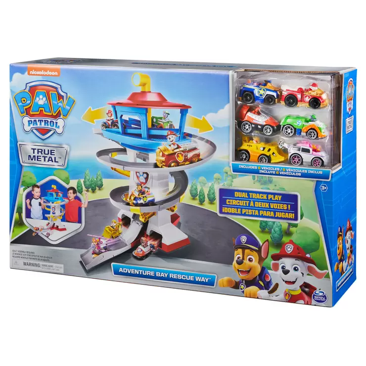 Experience double the fun with PAW Patrol and the True Metal Adventure Bay Rescue Way Playset. This exciting Lookout Tower track set includes six 1:55 scale PAW Patrol True Metal vehicles, including Chase and Marshall’s exclusive gold vehicles. Plus, the set features two racetrack paths that can launch all six PAW Patrol vehicles at the same time. Featuring authentic details and graphics, real working wheels and metal die-cast material—the True Metal vehicles look just like the PAW Patrol’s vehicles from the hit show. Load all of the vehicles in the set into the top of the tower and race to the rescue any way you want. Push the periscope to launch the pups into action and put out the fire at the bottom of the tower. Watch as the vehicles wind around the tower on the corkscrew path, activating dual-garage launchers for even more vehicle action; or use the diverter to send them straight down the drop ramp. PAW Patrol True Metal toys for boys and girls make great gifts for kids. Speed to the rescue with the PAW Patrol True Metal Adventure Bay Rescue Way Playset.