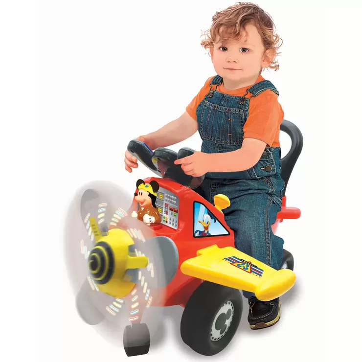 Ride with this Disney Princess on her plane as it plays fun sounds and has flashing lights. Press the dashboard for an accelerated engine noise or honk the horn for a realistic driving experience. Ride on includes removeable accessories for all stages of play. The rigid support around the seat offers extra safety and comfort, whilst the rocking base transforms ride-on to rocker for great rocking fun. The push handle is ideal for adult control and may be removed for growing toddlers. Ride for hours on this safe and durable aeroplane with this Disney Princess.