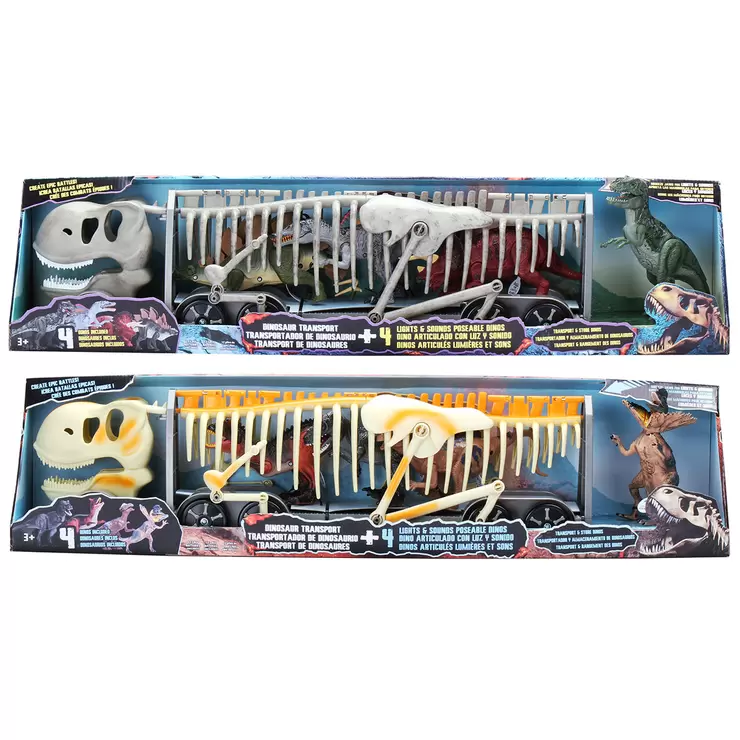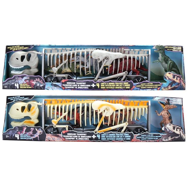 Let your imagination run wild with this 5 pack of highly detailed Poseable 9 inch (22.9cm) Dinosaurs. With your collection you can create your own epic Dinosaur battle as you play out your own story with friends! Squeeze the dinosaurs jaw for lights & sounds. Each figure is approximately 9 inches (22.9cm). The skeleton of a dinosaur becomes a transportation and storage vehicle for four completely posable dinosaurs. Dinosaurs include the Tyrannosaurus Rex, Dilophosaurus, Pachycephalosaurus, Carnotaurus, Triceratops, Stegosaurus and Spinosaurus. Gently closing the jaw activates the signature growl in each dinosaur as their eyes also light up when they scream. Small, but mighty dinosaurs reach their destination in this skeletal uber authentic dinosaur transporter. The legs of the skeletal carrier move with the wheels as it rolls to take the dinosaurs to their next stop. Loading and unloading is easy with a little help from any child 3 and up.