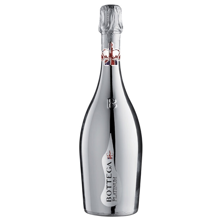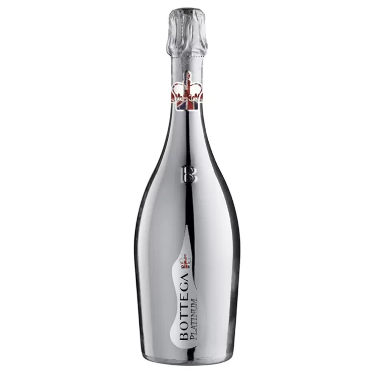 Bottega Platinum celebrates the Coronation of His Majesty The King. King Charles III, formerly known as The Prince of Wales, was born in 1948 and became heir apparent on the accession of Queen Elizabeth II in 1952.This special metallic bottle of brut sparkling wine has been painted with water-based, food-safe paints.