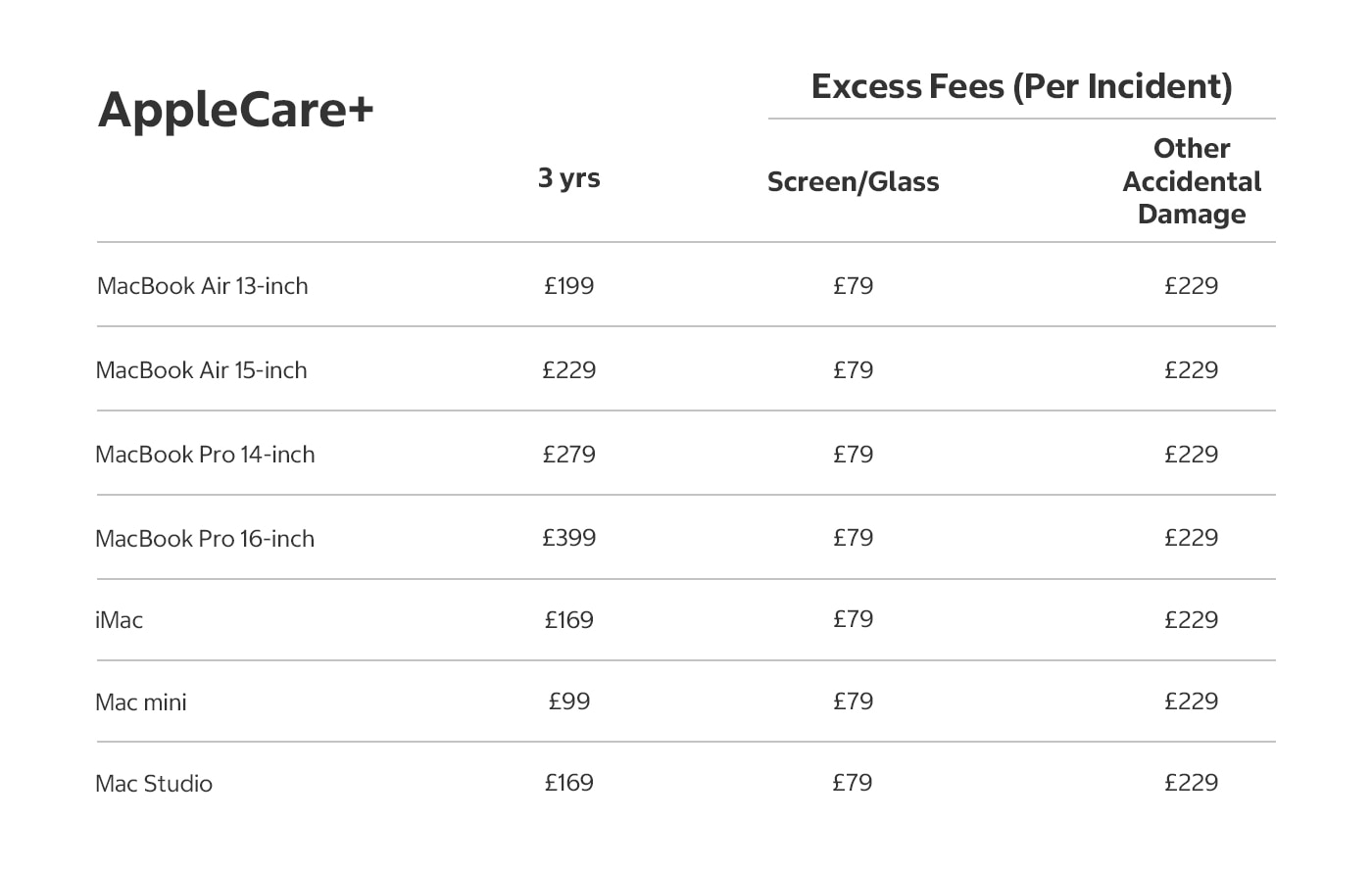 Get everything included in AppleCare+ and up to two incidents of theft or loss coverage every 12 months. Each incident is subject to the excess fee listed below.