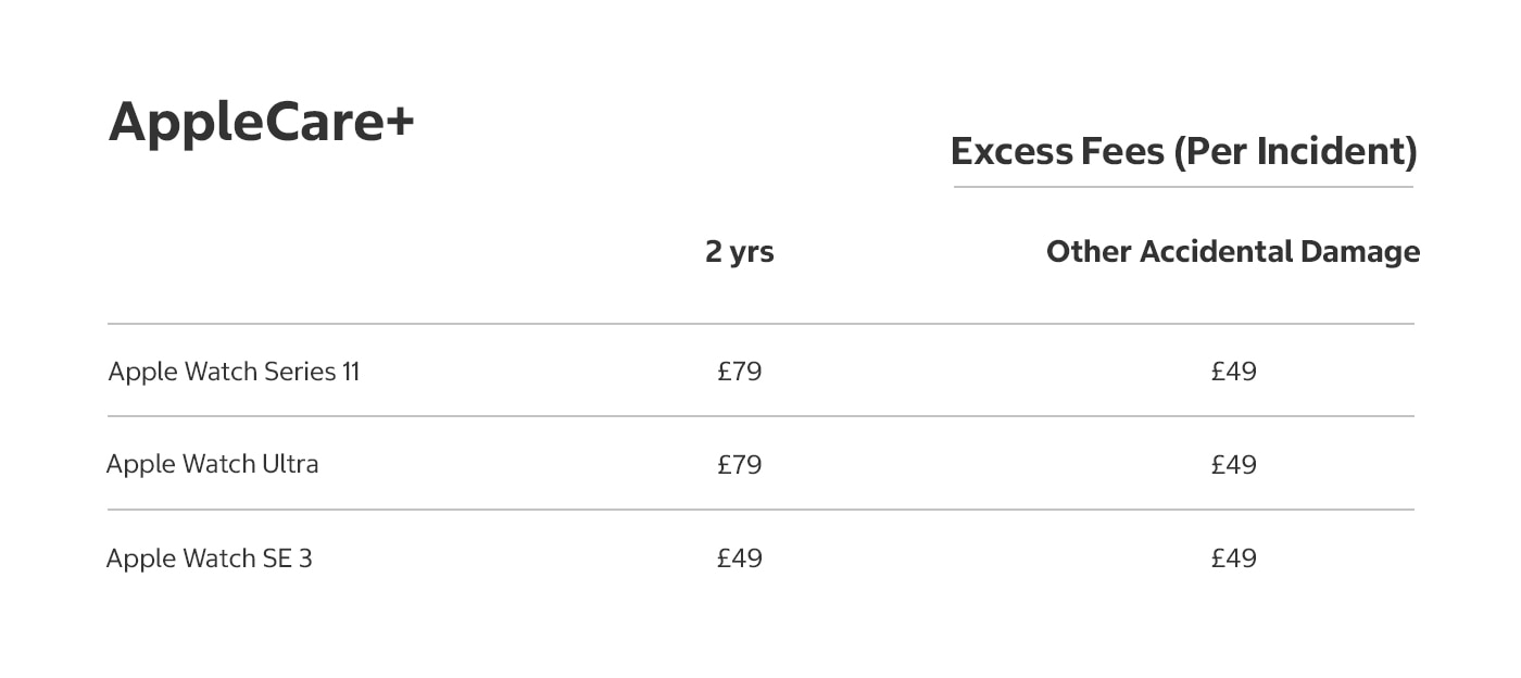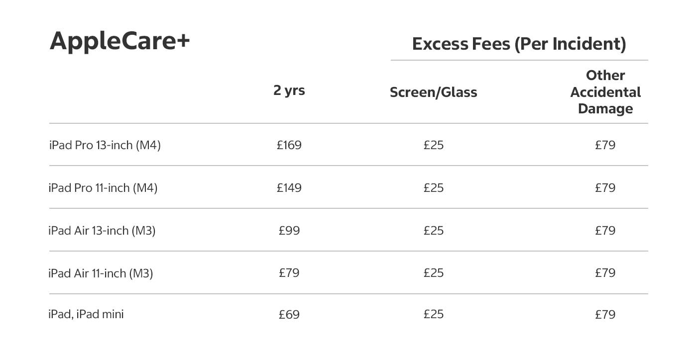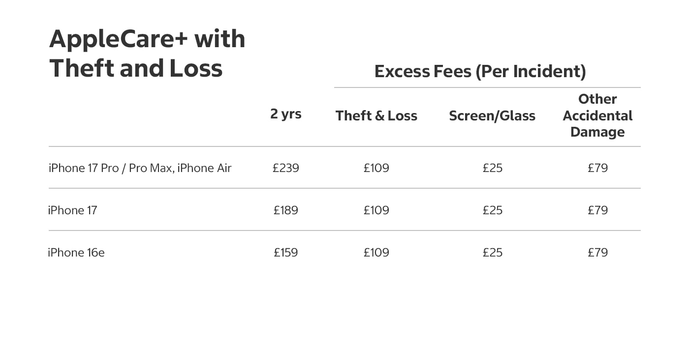 3. AppleCare+ products are available only for iPhone and its original included accessories. Both AppleCare+ products provide protection against (i) batteries that retain less than 80% of their original capacity, and (ii) unlimited incidents of accidental damage. AppleCare+ with Theft and Loss also provides coverage for up to two incidents of theft or loss every 12 months. Each incident is subject to an excess fee of £25 for a screen replacement or back glass damage, £79 for other accidental damage, or £109 for theft or loss. The back glass damage excess fee is only available for iPhone 12, iPhone 13, iPhone 14, iPhone 15 and iPhone 16 models. Any unused theft and loss incidents will expire after 12 months and you will get two more theft and loss incidents to use within the next 12 months of continued coverage. Express Replacement Service is not available under the screen replacement or back glass damage excess fee. Replacement equipment that Apple provides as part of the repair or replacement service may contain new or previously used genuine Apple parts that have been tested and pass Apple functional requirements. See AppleCare+ Terms and Conditions or AppleCare+ with Theft and Loss Terms and Conditions for full details.
