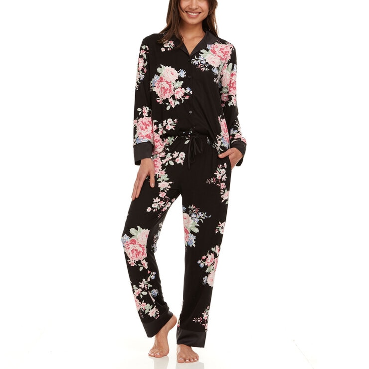 This Classic 2 Piece Notch Collar Pyjama has touches of satin trim which makes this elegant set the one you will want to wear every day. Long sleeve button down top and full length pants with pockets and drawstring make the pyjama set soft and comfortable with a relaxed fit.