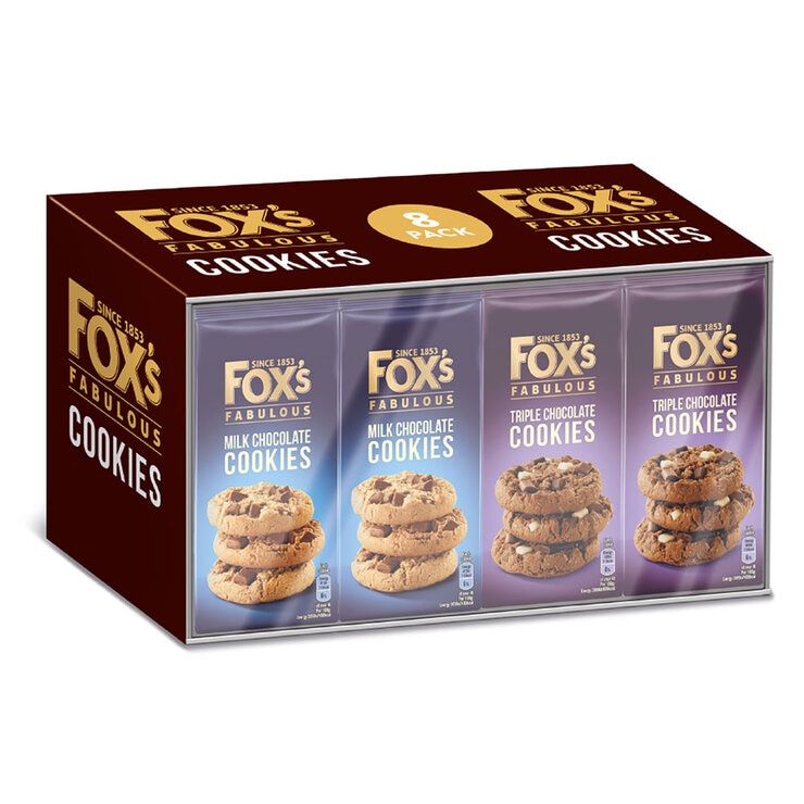 This Pack of Fox's Fabulous Cookies offers 4 packs of Fox’s Fabulous Triple Chocolate Cookies and 4 Packs of Fox's Milk Chocolate Cookies. Fox’s understands that every biscuit needs to give you a little moment of pleasure, and Fox's use expertise, developed since 1853, and high quality ingredients, to bake the fabulously tasty biscuits for you to enjoy.
