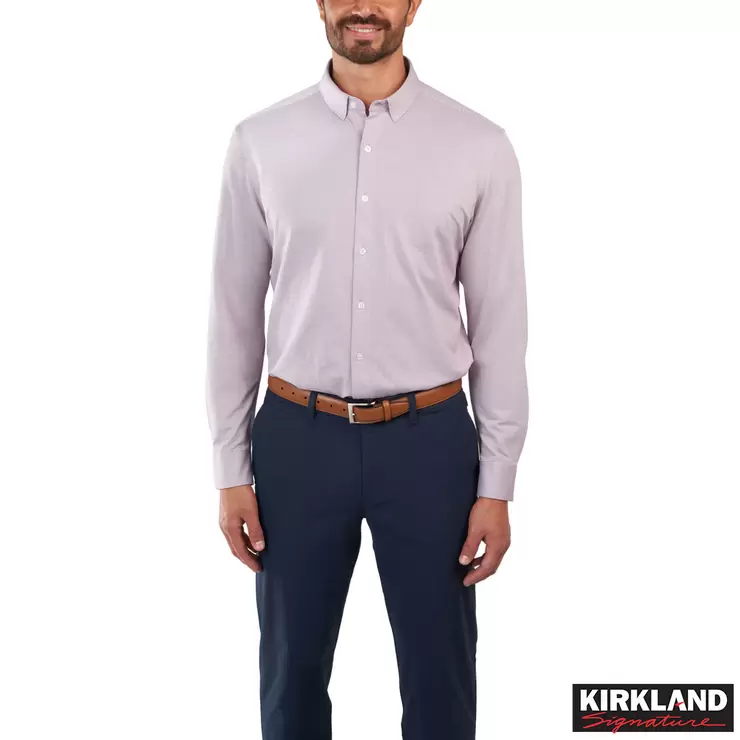 Elevate your button up shirt with the Kirkland Signature Men's Knit Button-Up Shirt. Crafted from a soft and breathable cotton-polyester blend, this shirt offers all-day comfort with the added benefit of wrinkle resistance. Whether you're dressing it up with trousers or keeping it casual with your favorite jeans, this versatile button up shirt adapts to many occasions. Available in three stylish patterns—mini domino in blue and red and grey windowpane.