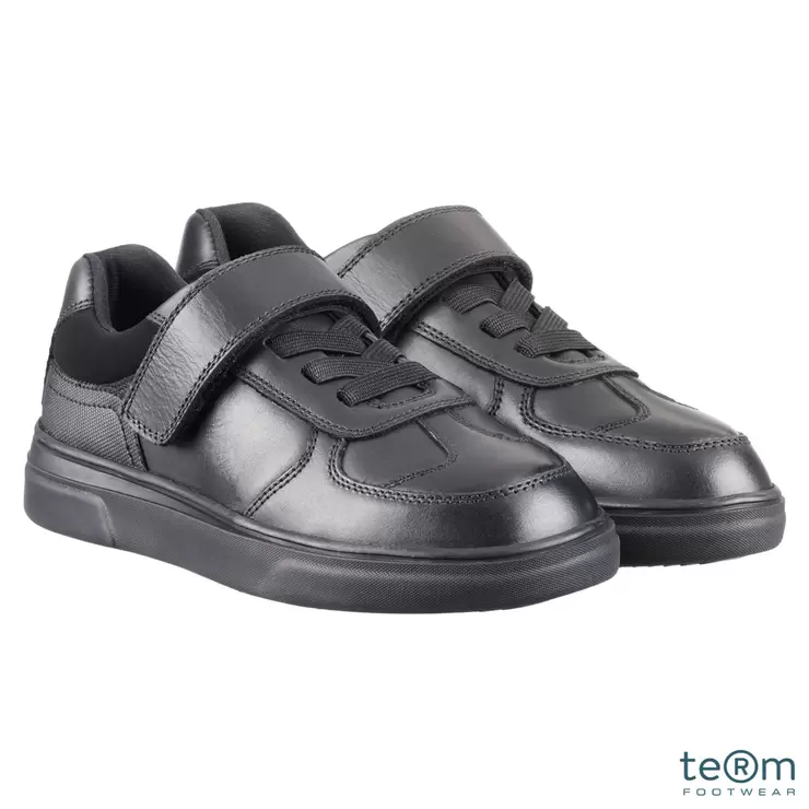 TeⓇm Unisex Black Leather Athletic Touch Tape Lace Up School Shoe, Junior 10